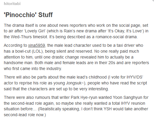 ada juga tentang drama Pinocchio yang di translate oleh Hitoritabi Tumblr