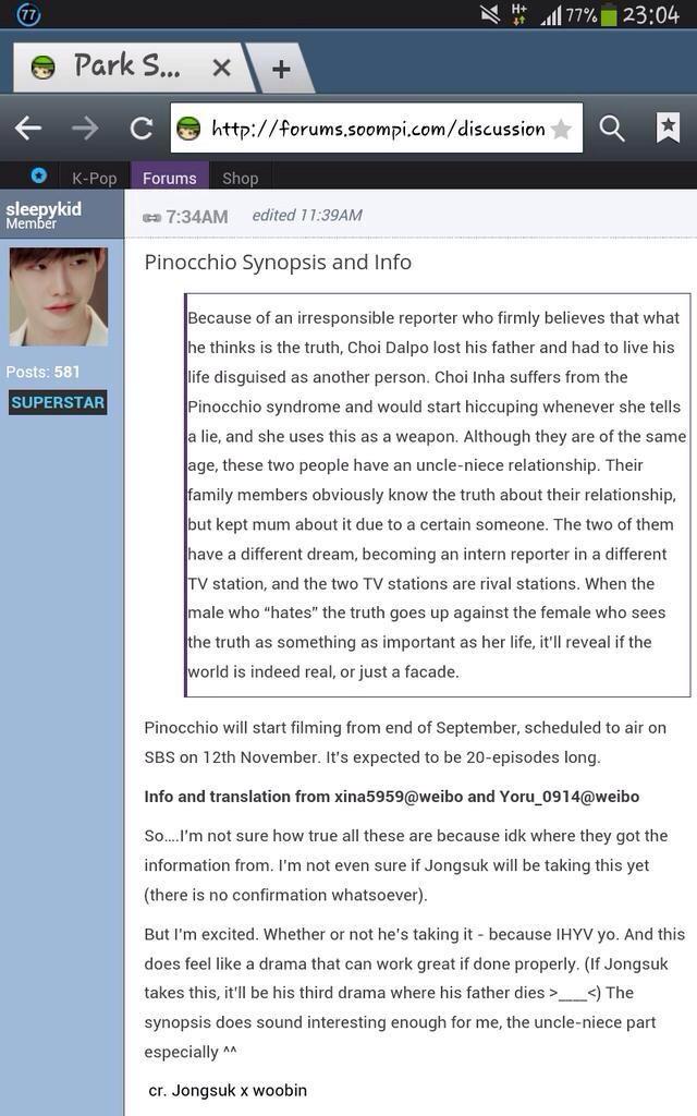 about Pinocchio stuff diatas juga kurang lebih menjelaskan tentang Pinocchio yang menceritakan tentang kehidupan reporter, cuma disitu hanya ditambahkan kalau pemeran utama pria (reporter) yang tadinya adalah seorang sopir taksi dengan potongan rambut seperti mangkuk (Lee Jong Suk) LOL.